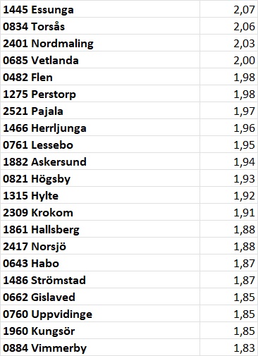 Bland de ca 20 första kommunerna så finns tre kommuner från Kalmar län.