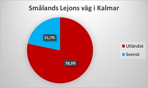 Den boende adress som har högst andel utländska namn är Smålands Lejons väg (Kalmarhem). Där finns 345 personer folkbokförda om jag undantar det äldreboende, Jungmansgården, som finns i området. Utav dessa folkbokförda har ca 270 personer utländska namn, vilket innebär drygt 78 procent. För drygt 7 år sedan var andelen mindre med ca 57,9 procent.