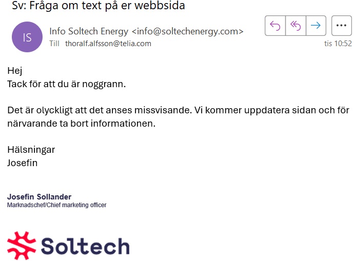 Soltech Energy Solutions är inget litet företag. De omsatte under 2024 ca 2,5 miljarder kronor med en förlust på ca -280 miljoner kronor. De borde vara mer seriösa!