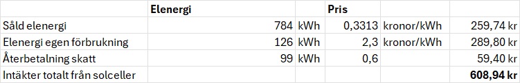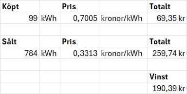 Nu har alltså min vinst minskat till endast 32,45 kronor. Den rörliga kostnaden på inköpt elenergi blir då 227,29/99= 2,30 kronor/kWh.
