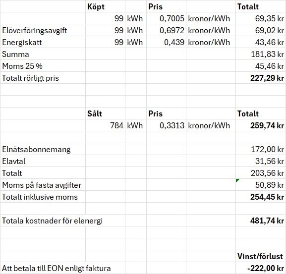 Jag skall alltså betala 222 kronor till EON trots att jag bara köpt 99 kWh samtidigt som jag sålt hela 784 kWh till EON! Men jag får ändå betala till EON!