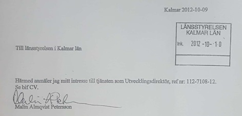 Nu kom landshövding Stefan Carlsson in i bilden. Helt plötsligt så kom man på att länsstyrelsen behövde en utvecklingsdirektör. Redan den 1 november 2012 anställdes då Malin Almqvist som utvecklingsdirektör med en lön på 60 000 kronor per månad.