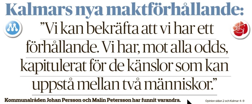Bara en månad senare avslöjades att alla rykten om att kommunalrådet Johan Persson (S) och oppositionsrådet Malin Petersson Almqvist (M) inlett en relation. En riktig skandal för de inblandade partierna. Något som bekräftades i Barometern i juni 2012.