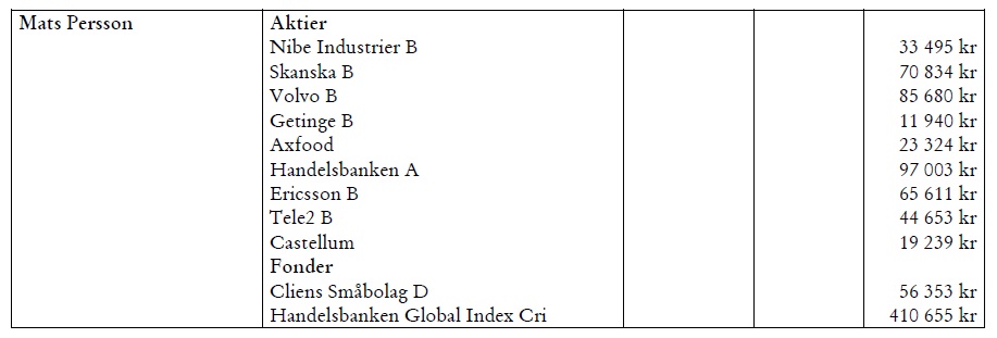 Avgående arbetsmarknadsministern Mats Persson anklagades för att ha köpt aktier i Ericsson under våren men i artiklarna framgår det inte hur mycket han handlat aktier för vid detta tillfälle. Enligt det ekonomiska registret så äger Mats Persson aktier i Ericsson till ett totalt värde av ca 65 000 kronor.