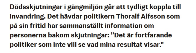 – Då blir det tydligt att 96–97 procent av dödsskjutningarna i den gängkriminella miljön drabbar invandrare. Jag drar då slutsatsen att skjutningarna också är utförda av invandrare då det enligt domar nästan uteslutande är individer med utländsk bakgrund som döms, säger Alfsson.