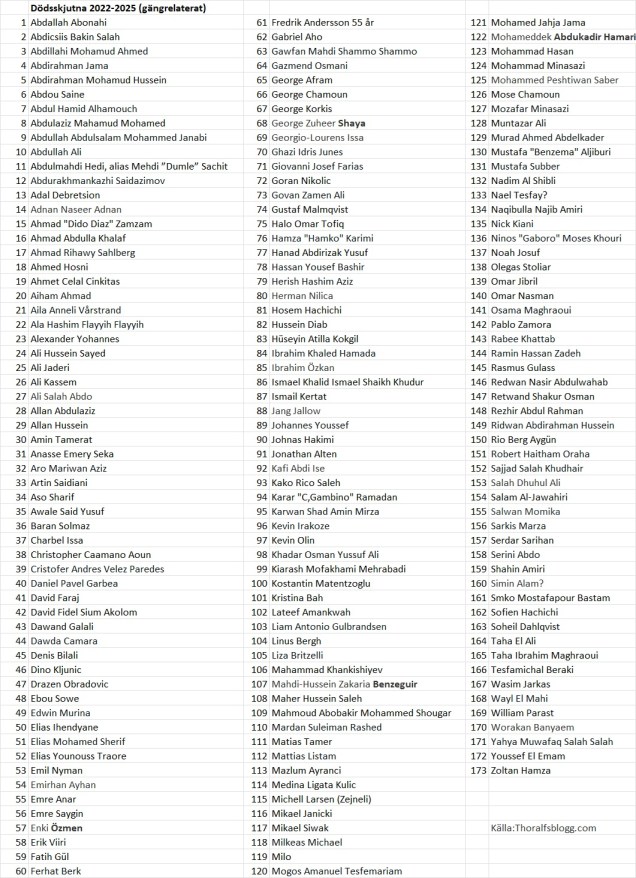 Här är listan med de dödsskjutna som jag lyckats identifiera 2022-2025.