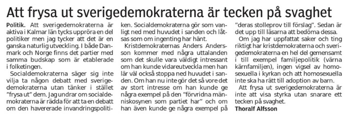 Nästa steg i min utveckling inom SD blev att jag började skriva insändare i de lokala tidningarna. Detta innebar samtidigt att jag skulle bli en offentlig person och talesperson för Sverigedemokraterna i Kalmar. Jag tror att media och lokalpolitiker från 7-klövern hade varit väldigt glada och nöjda över att det inte funnits några Sverigedemokrater tidigare i Kalmar. Så när jag började göra min röst hörd på allvar i Kalmar möttes jag av en hel del påhopp men också av en total tystnad, inga repliker eller genmälen. Taktiken på riksnivå var ju att SD skulle isoleras och tystas, den taktiken gällde även på det lokala planet. När jag tittar tillbaka i mina tidningsurklipp så tror jag att min första insändare i Barometern publicerades den 14 juli 2005. Här är troligen min första insändare, dock utan partibeteckning. Nu kommer jag inte ihåg om det var så jag skrev under den utan partibeteckning, på grund av att Barometern inte publicerade insändare med partibeteckningen SD.