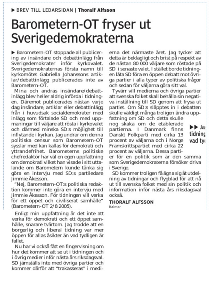 Under valrörelsen skrev jag flera insändare med koppling till kyrkovalet men lokaltidningarna stängde dörren helt och hållet för mina insändare angående kyrkovalet. Från början av augusti fram till valdagen publicerade lokaltidningarna inte en enda av mina inskickade insändare. Då förstod jag hur motarbetade Sverigedemokraterna var och att media inte var fullt så demokratiska som de låtsades att vara. Det fria ordet gällde bara de med rätt partifärg, i synnerhet de med någon röd nyans. Eftersom insändarsidorna uppenbarligen var stängda för Sverigedemokraterna så skickade jag istället ett brev till Barometerns ledarsida efter kyrkovalet med mina reflektioner och till min stora förvåning publicerades det den 26 september på ledarsidan, en vecka efter kyrkovalet. Läs och häpna.