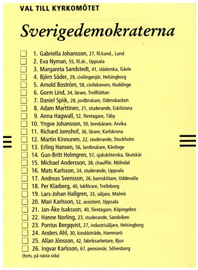Flera av namnen återfinns idag i Sveriges riksdag eller har suttit tidigare mandatperioder, medan flera personer har lämnat partiet eller till och med blivit uteslutna från partiet. Gabriella Johansson heter idag Gabriella Hedarv och Margareta Sandstedt skulle bli Margareta Larsson och är Louise Erixsons mamma och skulle bli Jimmie Åkesson svärmor. En episod som inträffade under kyrkovalet kommer jag fortfarande väldigt väl ihåg. Jag hade tagit på mig ansvaret för att köra ut valsedlarna till alla vallokalerna i församlingarna inom Kalmar, Nybro och Torsås kommuner. Det var dock många inom Svenska kyrkan som var väldigt kritiska till SD och därför kände jag mig både lite obekväm och orolig när jag skulle åka ut till pastorsexpeditionerna med valsedlarna. Det gick väldigt bra på en rad ställen även om mottagandet var långt ifrån hjärtligt, på de flesta ställen så uppträdde personalen i varje fall korrekt och artigt. Men så kom jag till pastorsexpeditionen i Arby, söder om Kalmar. I lokalen fanns både en kanslist och prästen Magnus Sollersten. När jag presenterad mig och framförde mitt ärende fick prästen Magnus Sollersten ett utbrott, där jag skälldes ut efter noter och jag och partiet kallades för både rasister och