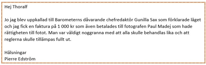 I mellandagarna fick jag ett brev från Barometern och deras chefredaktör Gunilla Andreasson (senare bytte hon efternamn till Sax). Brevet innehöll en faktura på 6 000 kronor för att jag publicerat Barometerns bild på min blogg, ett intrång i deras och fotografens upphovsrätt. En riktig kalldusch! Jag var osäker på om det bara var ett skrämskott eller om Barometern tänkte driva kravet. Jag tänkte i varje fall inte betala fakturan i första taget. Det var tyst från Barometern en tid men i slutet av februari när jag kommer hem efter en vecka på Gran Canaria så ligger ett brev i posthögen där Barometern hotar med Kronofogden och indrivning om jag inte betalar fakturan. Någon dag senare upptäcker jag att folkpartisten Pierre Edström på sin blogg skrivit om min faktura med krav från Barometern och gjort sig lustig över fakturan. Men även hans sambo, vänsterpartisten Birgitta Axelsson Edström hade skrivit om fakturan. Hur kunde de veta något om min faktura? Jag hade inte nämnt fakturan för en enda person i min bekantskapskrets. Det kan därmed bara vara anställda på Barometern som läckt uppgifterna till Pierre eller Birgitta. Jag blev minst sagt upprörd över att Barometern lämnat ut uppgifter om fakturan! Så här skrev Pierre Edström på sin blogg.