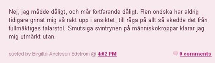 Jag skrev i min dagbok att jag nästan fick en overklighetskänsla av att de ”tävlade” om vem som framstod som mest politisk korrekt och vem som tog kraftigast avstånd från SD och vem som därmed skulle få störst rubriker i lokal-tidningarna Barometern och Östran. Vem som kunde säga de mest kritiska, negativa och kraftfulla epiteten om mig och Lars Rosén och Sverigedemokraterna och som därmed var den godaste och finaste i hela Kalmars kommunfullmäktige-församling. Men de värsta påhoppen och angreppen, kom på sociala medier efter kf-mötet. Den som var ledande av politikerna var vänsterpartisten Birgitta Axelsson Edström. Hon liknade mig och min kollega Lars Rosén vid ”smutsiga svintrynen på människokroppar”. Det märkliga var att ingen i media reagerade på hennes fula och kränkande text. Inlägget finns fortfarande kvar på hennes blogg. På sin blogg skrev hon nedanstående.