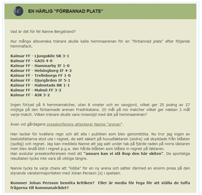 Tränaren Nanne Bergstrand fick efter en match i juli mot Malmö FF på Fredriksskans ett utbrott vid presskonferensen, där han kritiserar det mesta på Fredriksskans, till och med gräset som var för långt enligt Bergstrand. Han passade också på att ”idiotförklara” alla som ansåg att en ny arena skulle ligga vid Fredriksskans. Efter nästa hemmamatch mot AIK var tränaren Nanne Bergstrand igång igen vid presskonferensen och kallade Fredriksskans en ”förbannad plats”. Jag reagerade på Nanne Bergstrands utbrott och skrev ett blogginlägg.