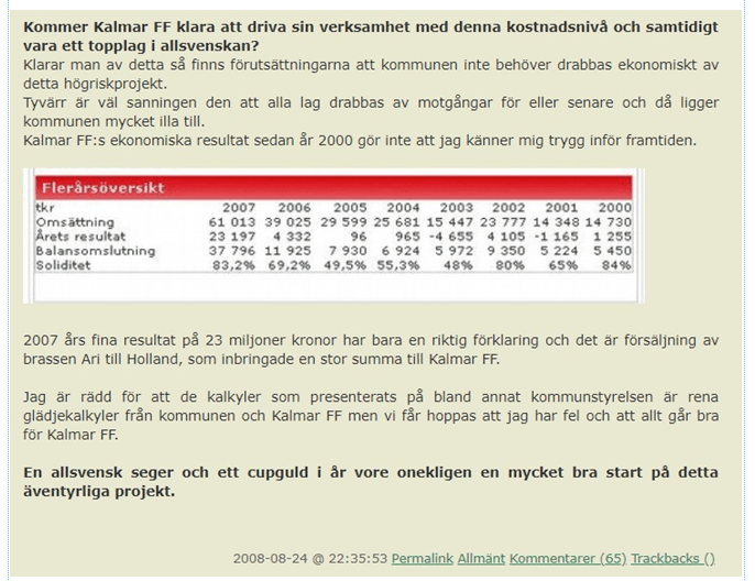 Som kommunpolitiker så handlar mitt ansvar i första hand om att kärnverksamheterna skall fungera och det med ett rimligt skatteuttag. Hela projektet med en ny arena såg jag som ett stort riskprojekt och jag var skeptisk till de kalkyler som presenterat av arbetsgruppen och av majoriteten genom kommunalrådet Johan Persson.