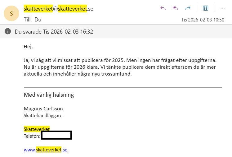 Den 27 december så ställde jag några frågor till Skatteverket angående uppgifter om olika trossamfund som Skatteverket sköter avdrag för kyrkoavgift för. Det gäller flera olika religioner men framförallt kristna och muslimska samfund.