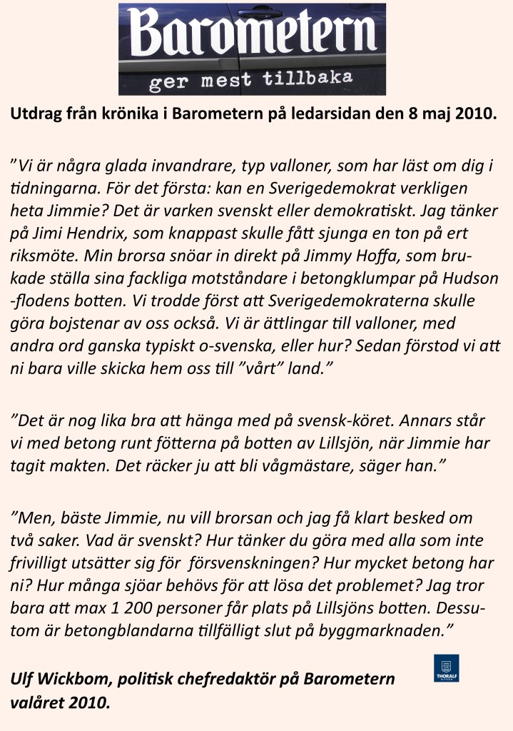 Den 1 maj 2010 anställdes Ulf Wickbom, som politisk redaktör för ledarsidan i Barometern och redan lördagen den 8 maj så vädrade han sitt hat mot SD på ledarsidan med en bedrövlig krönika. Krönikan publicerades aldrig på webbsidan, utan den stoppades troligen av ledande personer på Barometern och Gota Media. Jag gjorde igår ett litet utdrag från krönikan som jag publicerade på Facebook. Min förhoppning är att det skall uppmärksammas och delas och kanske bli viralt. Gå in på FB och dela och kommentera. Här är bilden som jag lagt upp.