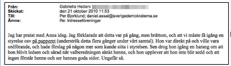 När Aftonbladet publicerade mejlet angående SD-Kvinnor från Gabriella Hedarv till Per Björklund och Daniel Assai så framgick det vilket fulspel som pågått inom partiet. Mejlet skrevs den 21 oktober, alltså 8 dagar efter det att ansökan redan skickats in till partibidragsnämnden, underskriven av Jimmie Åkesson.