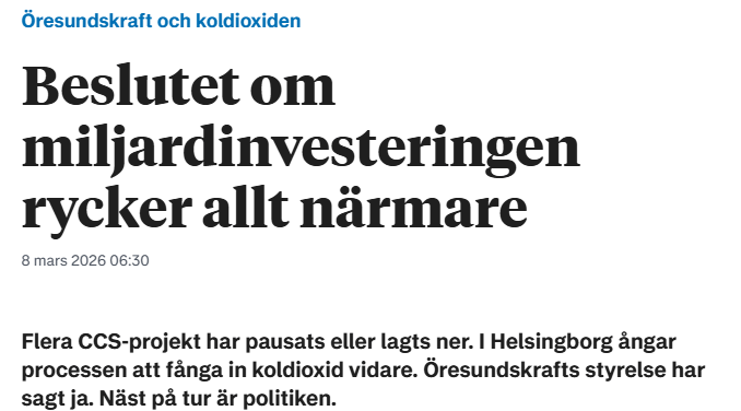 I Helsingborg planerar kommunen att bygga en anläggning för ca 3,5 miljarder kronor för koldioxidinfångning trots att många andra kommuner har lagt liknande planer på hyllan. Öresundskraft har redan beviljats stöd på 900 miljoner kronor. Stödet är sannolikt mest skattemedel från myndigheter och EU gissar jag. Enligt uppgift skall politikerna i Helsingborg fatta beslut den 19 maj.