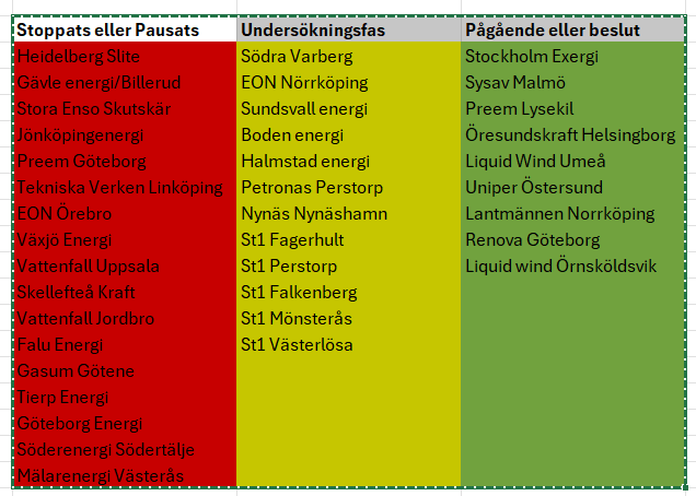 • Mälarenergi (Västerås): Pausade nyligen sin storskaliga satsning trots lyckade tester. Investeringen beräknades kosta omkring 4 miljarder kronor, vilket bedömdes som för dyrt för bolaget att bära ensamt.