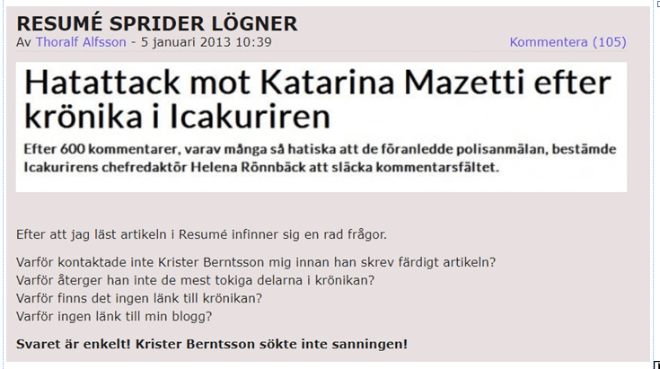Ganska omgående blev jag anklagad för att bedriva en hatkampanj mot Mazetti och ICA-Kuriren. Först ut var Bonniertidningen Resumé. Det var en mycket märklig artikel som var fylld med felaktigheter och som undanhöll läsarna från vad Mazetti skrivit i sin krönika, vilket i sig var avslöjande.