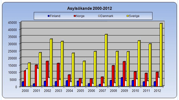 På bloggen rapporterade jag kontinuerligt om antalet asylsökande, anhöriginvandring och ensamkommande barn eller som jag föredrog att kalla det, ensamkommande muslimska män. Det fanns dock andra epitet på dessa ensamkommande som jag dock undvek. För att få någon referens till galenskapen i Sverige så tog jag också fram motsvarande siffror för våra nordiska grannländer som jag visade i mina diagram på bloggen. Så här kunde ett diagram se ut under våren 2013 när det gällde antalet asylsökande.