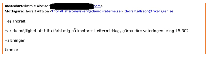 Jag hade en promenad på ca 20-25 minuter från Östermalm ned till riksdagen och när jag kommit på plats på mitt rum och startade min riksdagsdator och så småningom kollade min mejlkorg hade jag fått nedanstående mejl.